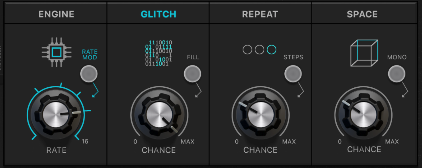 • Rate Knob controls how quickly the glitch effects change, Mod Rate Button randomizes the rate