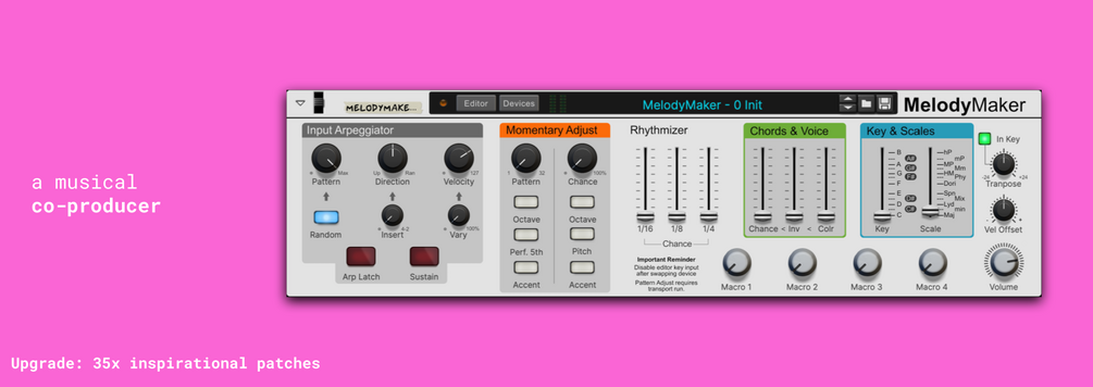 The Melody Maker was inspired by the Futurephonics Rhythmizer Midi VST, and provides both random and patterned midi augmentation features. Simply swap out the instrument inside for any other instrument and press any key to start playing like you've never played before.