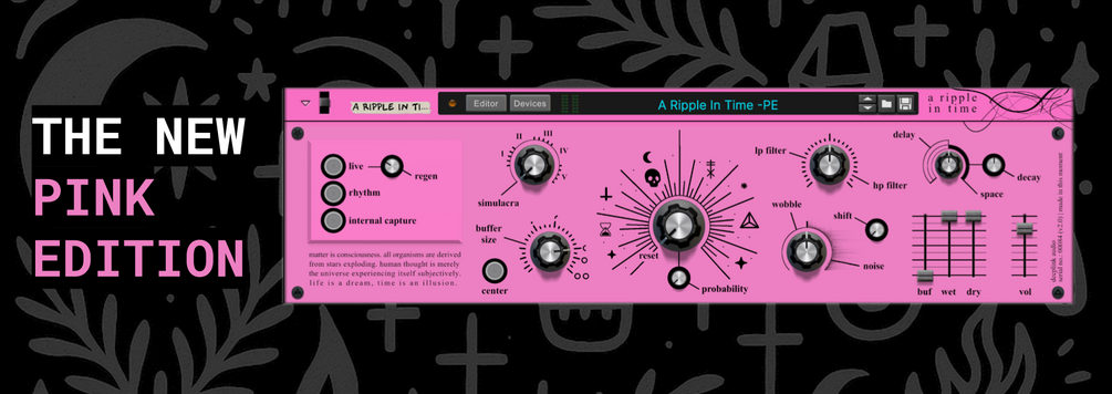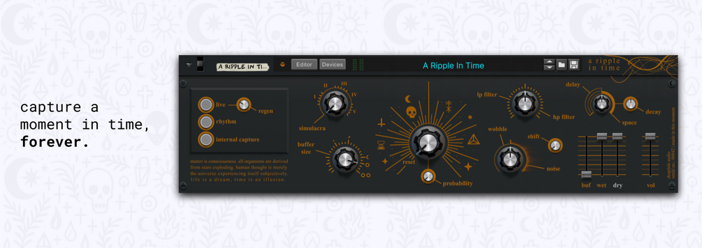 a ripple in time can capture or delay audio (up to 2 bars), mangle it, rearrange it and re-pitch it for all eternity. It can craft new loops from any audio that you run through it, and - if you want - turn those loops into weird, dirty or spacious ambient textures.